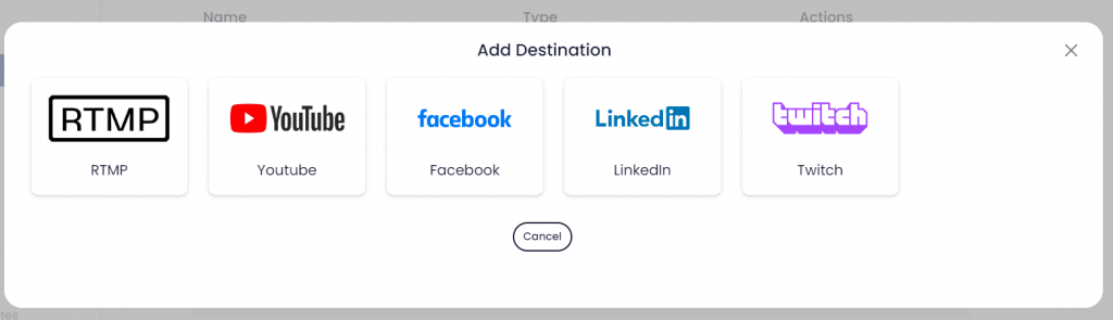 - Select within the type of destinations you want to add (Facebook, YouTube, LinkedIn, Twitter, Twitch, and custom RTMP)